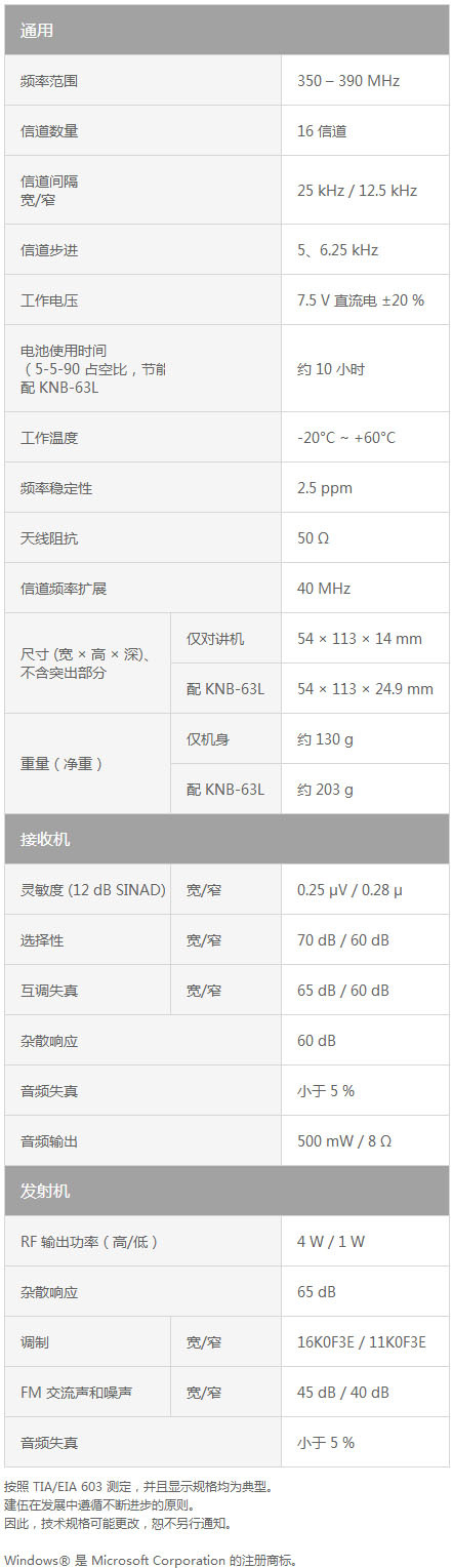 - 一體式包裝(天線、鋰離子電池、快速充電器及皮帶夾)
