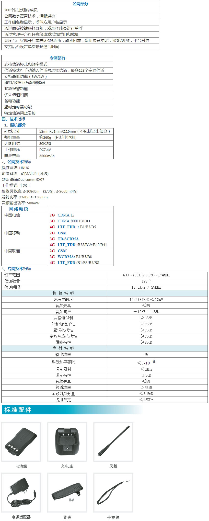 電池電量顯示、多種工作模式:公網單守候、專網單守候、公專網雙守候、網關中繼功能。